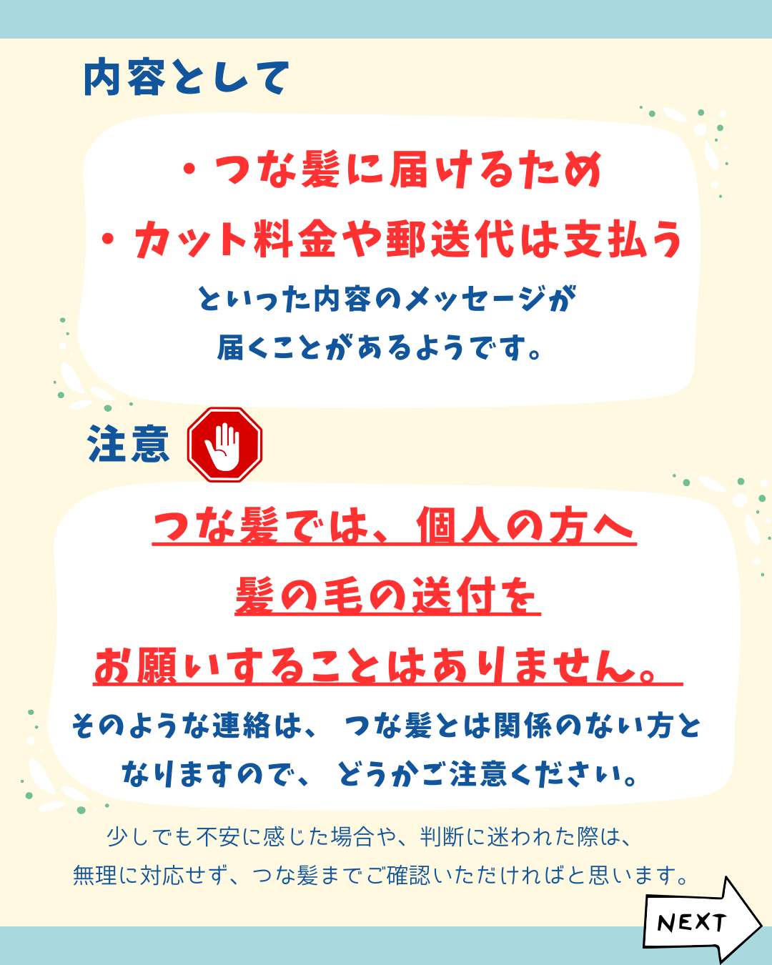 つな髪では、個人の方へ髪の毛の送付をお願いすることはありません。