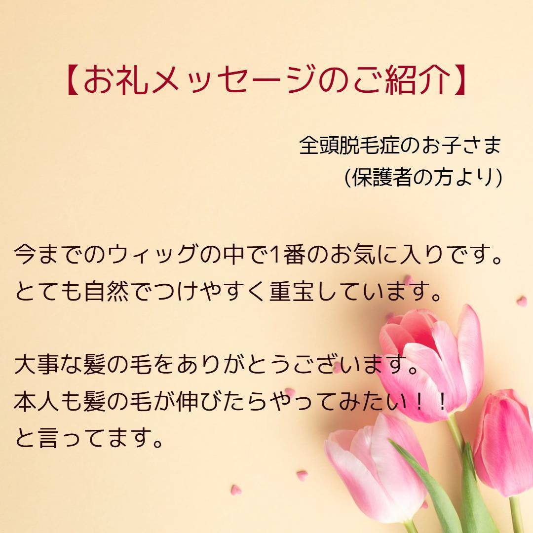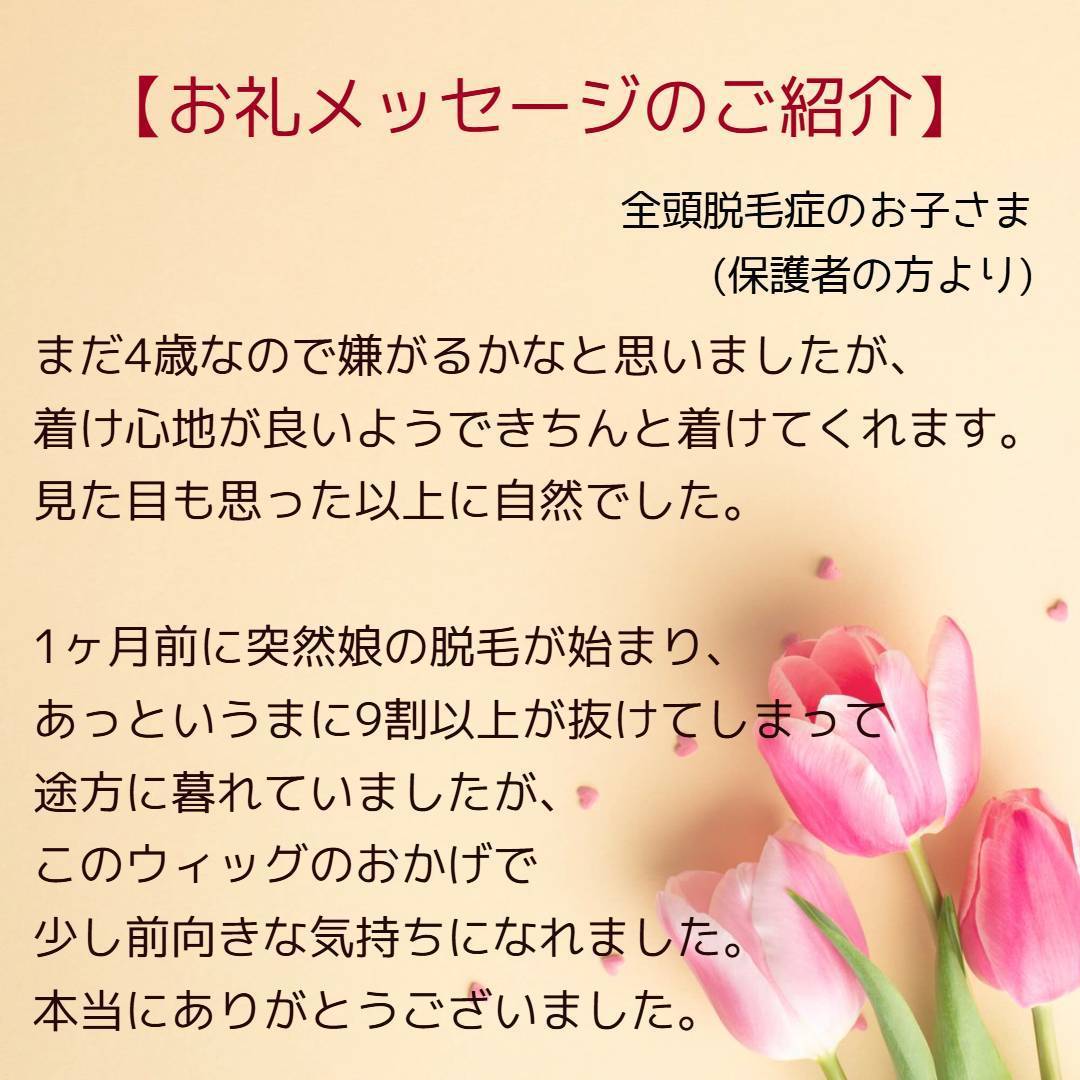 1ヶ月前に突然娘の脱毛が始まり、あっというまに9割以上が抜けてしまって途方に暮れていましたが、このウィッグのおかげで少し前向きな気持ちになれました。本当にありがとうございました。